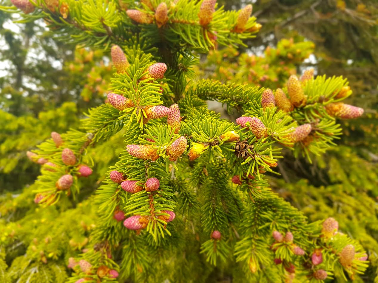What we saw were immature male cones—also known as pollen cones or microstrobili. These are relatively consistent in structure across conifer species, differing only in minor ways like the arrangement of scales. The pink ones, in particular, are visually striking and an unexpected joy to find on a mountain walk.